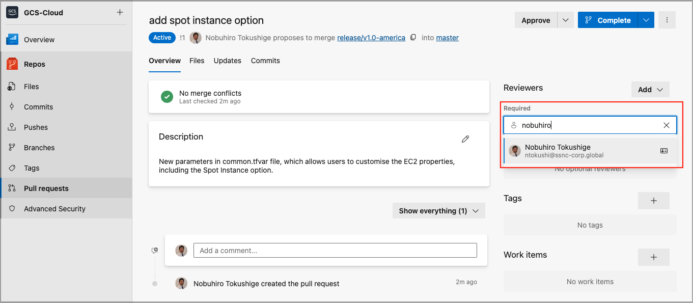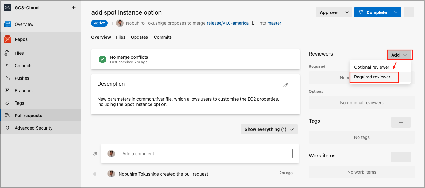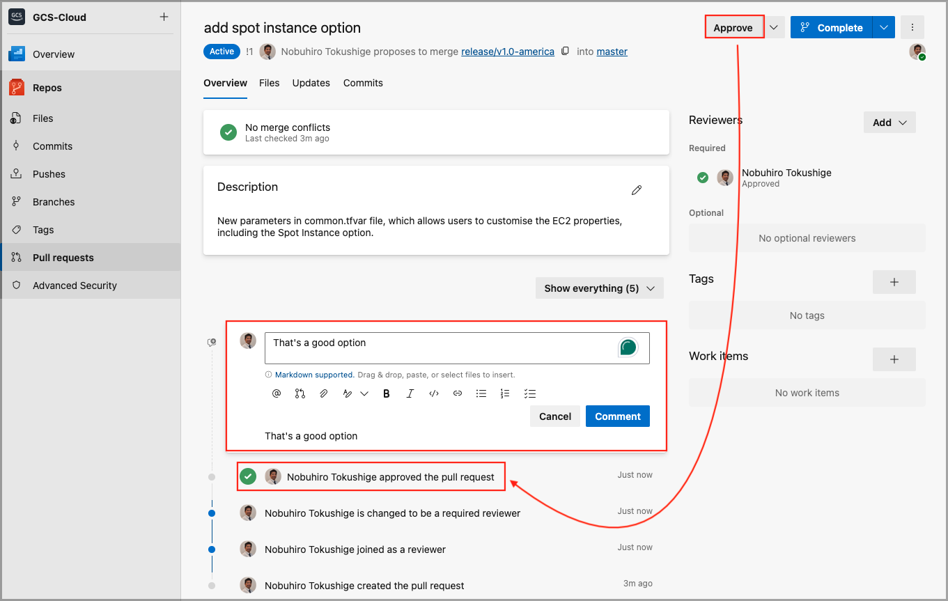 This guide demonstrates how to approve a pull request from the release/v1.0-america branch into the master branch in Azure DevOps or any Git repository.