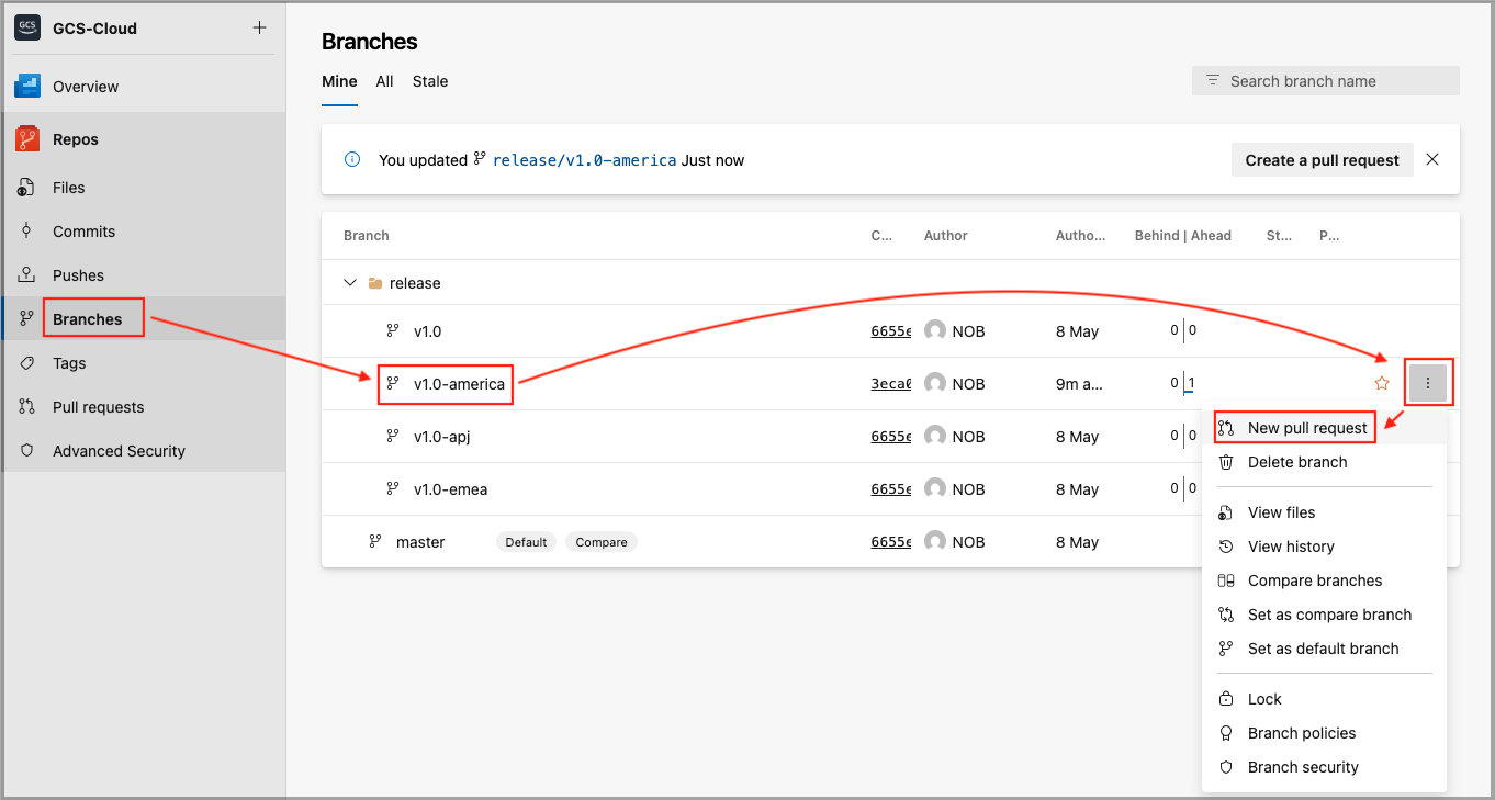 release/v1.0-america - Click on the "…" (More options) next to it and select “New pull request”