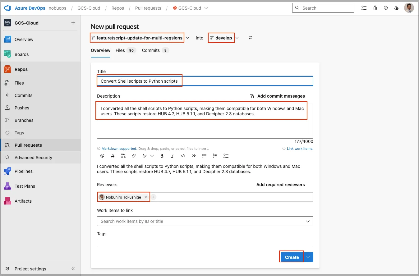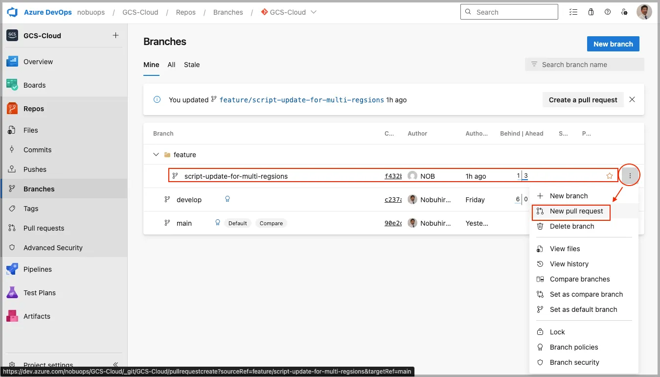 This guide shows how to push changes from the feature/script-update-for-multi-regsions branch to the develop branch in Azure DevOps