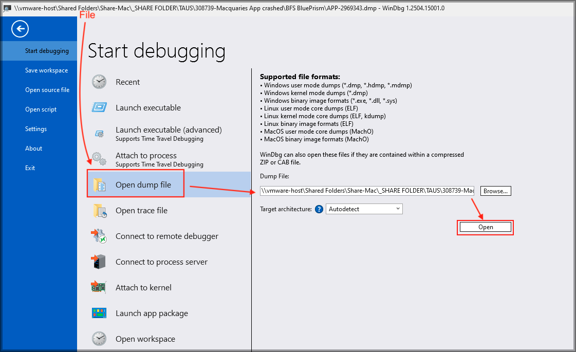 Click File > Open dump file.