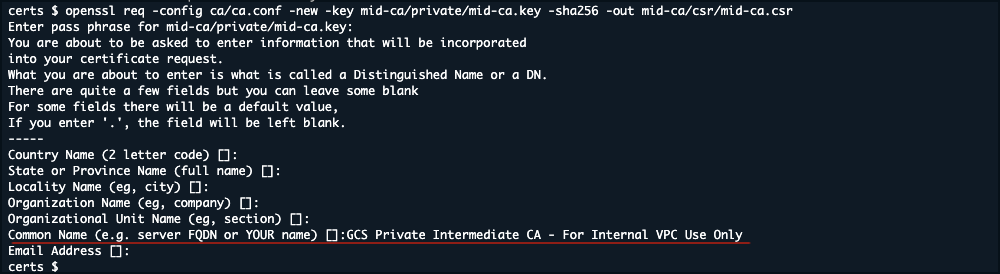 openssl req -config ca/ca.conf -new -key mid-ca/private/mid-ca.key -sha256 -out mid-ca/csr/mid-ca.csr