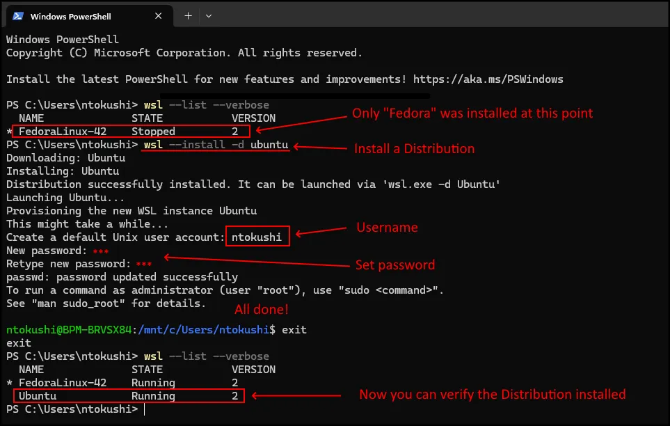 This guide explains how to install a Linux distribution on Windows Subsystem for Linux (WSL). It covers the installation command using PowerShell, the password setup process, and how to verify the installation by listing all installed distributions.